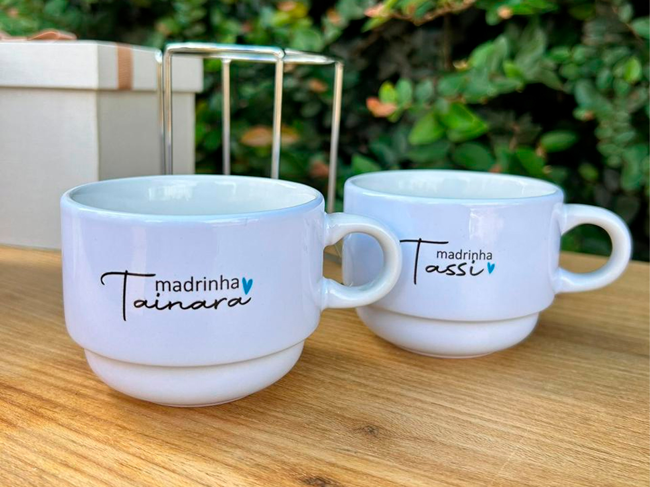 Produzidas em cerâmica branca de alta qualidade, elas recebem personalização com nomes, palavras ou mensagens especiais, garantindo um toque exclusivo e afetivo. Ideais para madrinhas, padrinhos, familiares, amigos ou até para uso corporativo.